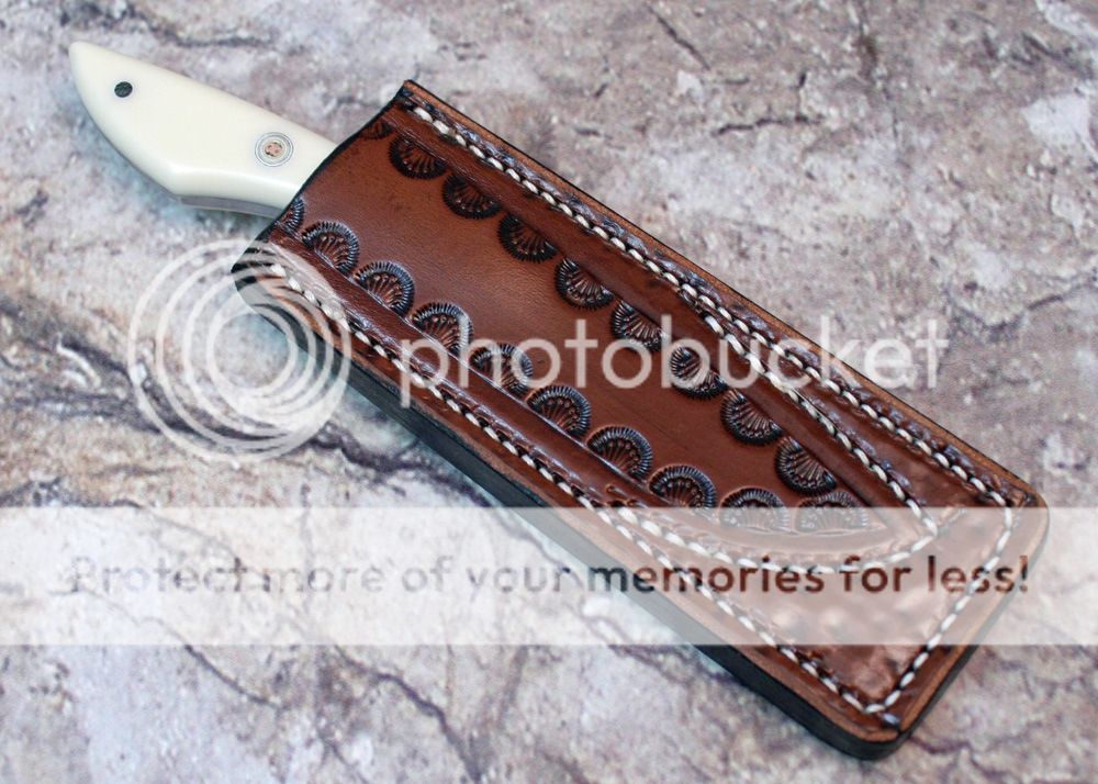 The sheath is 8-9oz hand tooled leather and is made to slip in the pocket nicely. The knife fits nice and snugly.