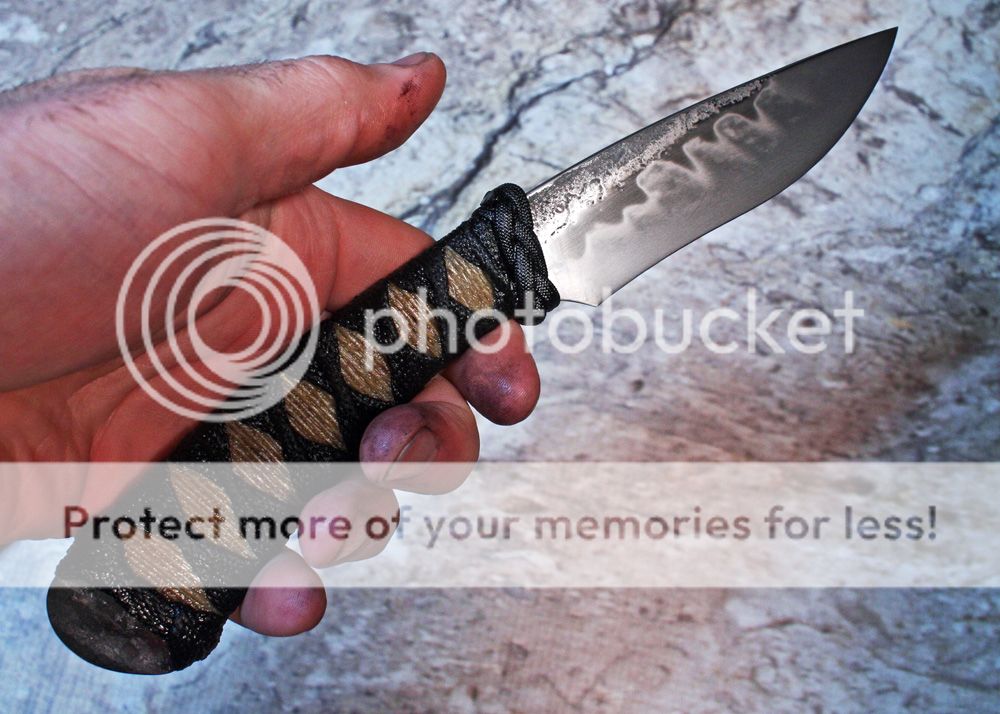Here is a forged W2 recurve fighter. The blade has been clay quenched for a nice hamon. It is some of Don Hanson's W2 so the hamon really shows a lot of figure. It has been polished to 200 grit then etched. The spine has been radiused for comfort.