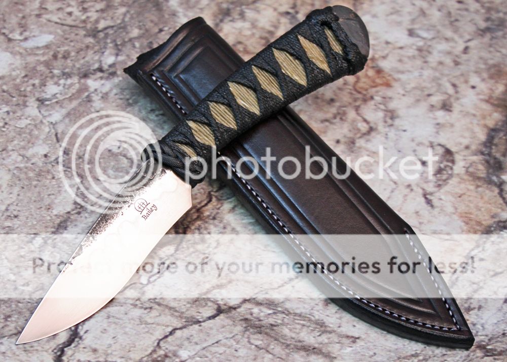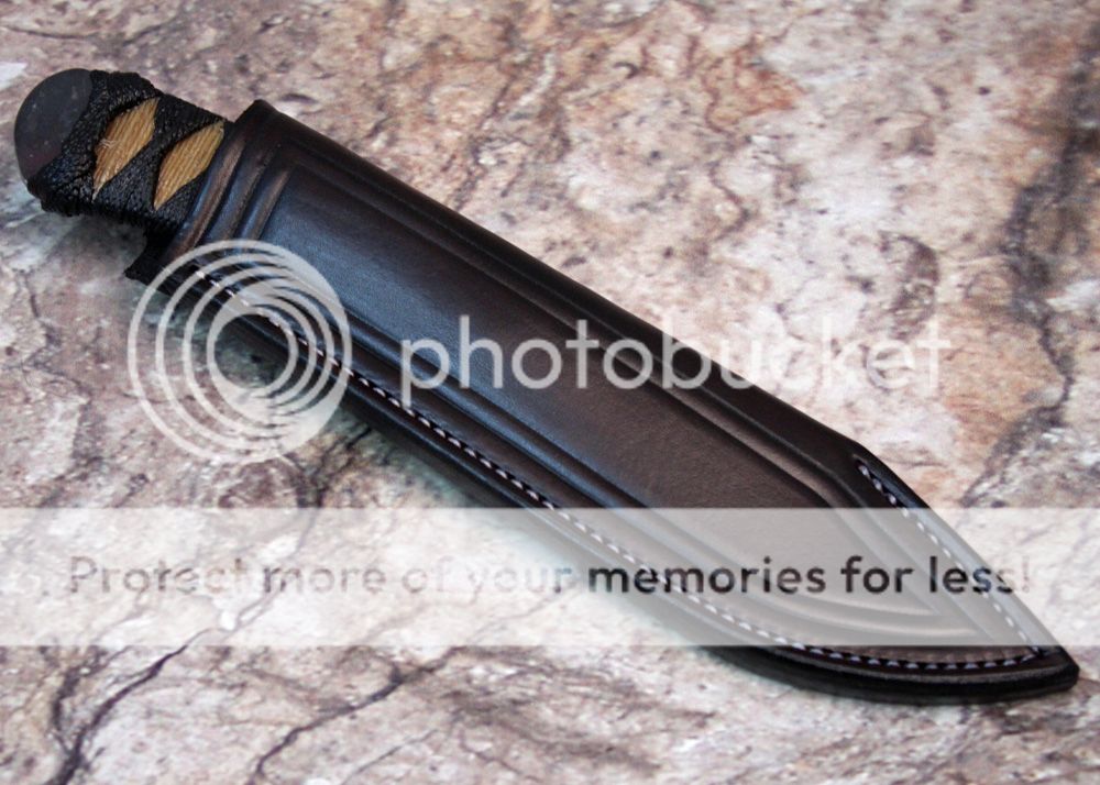 The sheath is 7-8oz hand tooled leather from Wickett and Craig. The knife draws nicely and fits snugly.