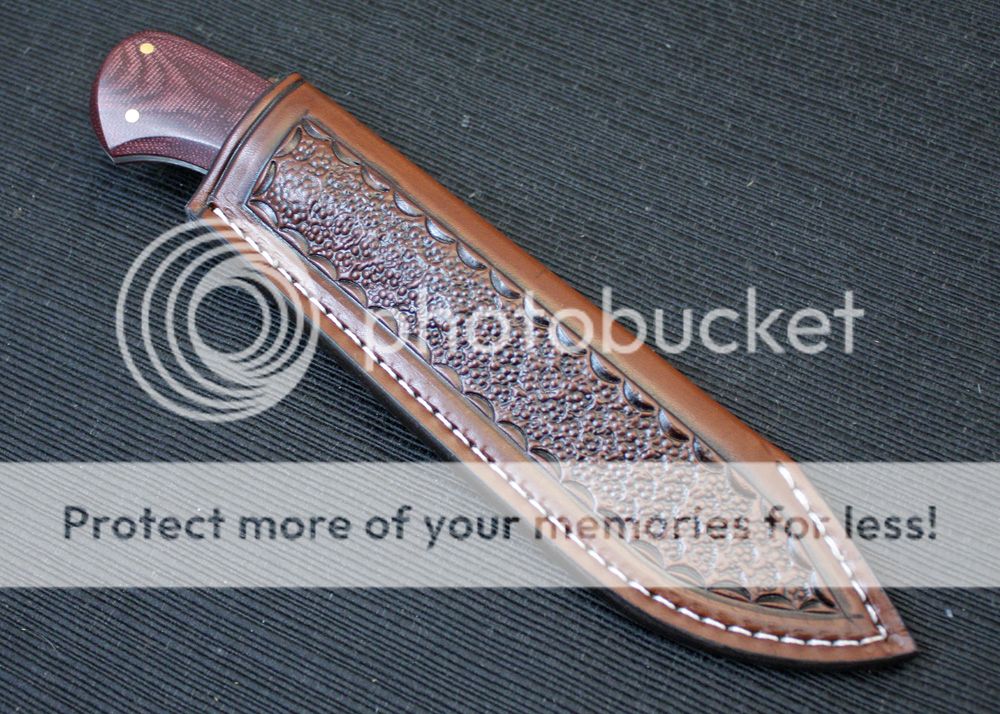 The sheath is 7-8oz hand tooled leather from Wickett and Craig. The knife fits snugly, and yet draws easily.