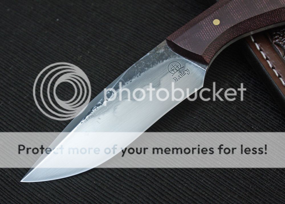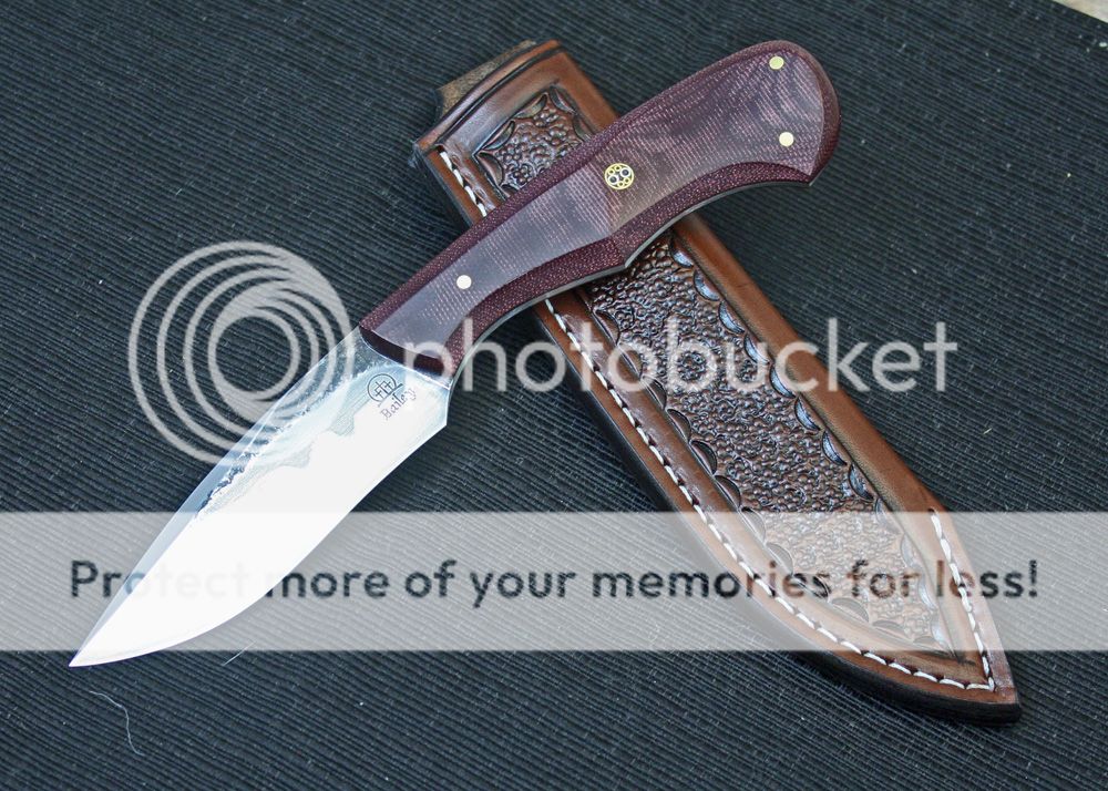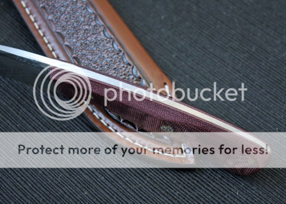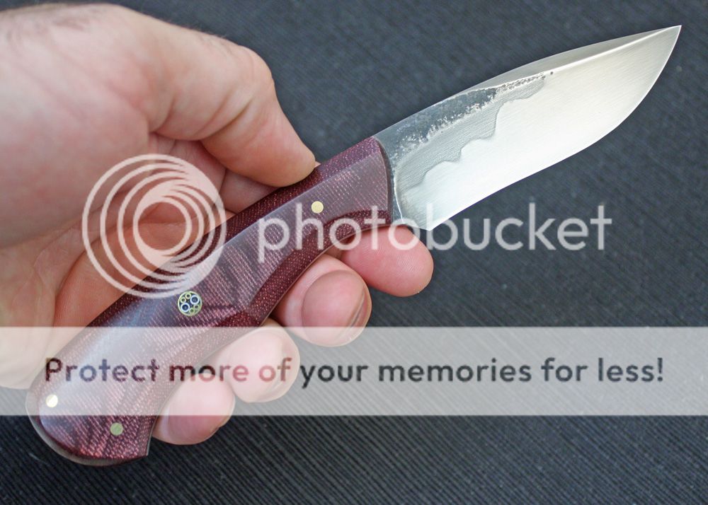 The handle is maroon canvas micarta. It is faceted and fits well in the hand. It is held in place with pins and G-flex epoxy.