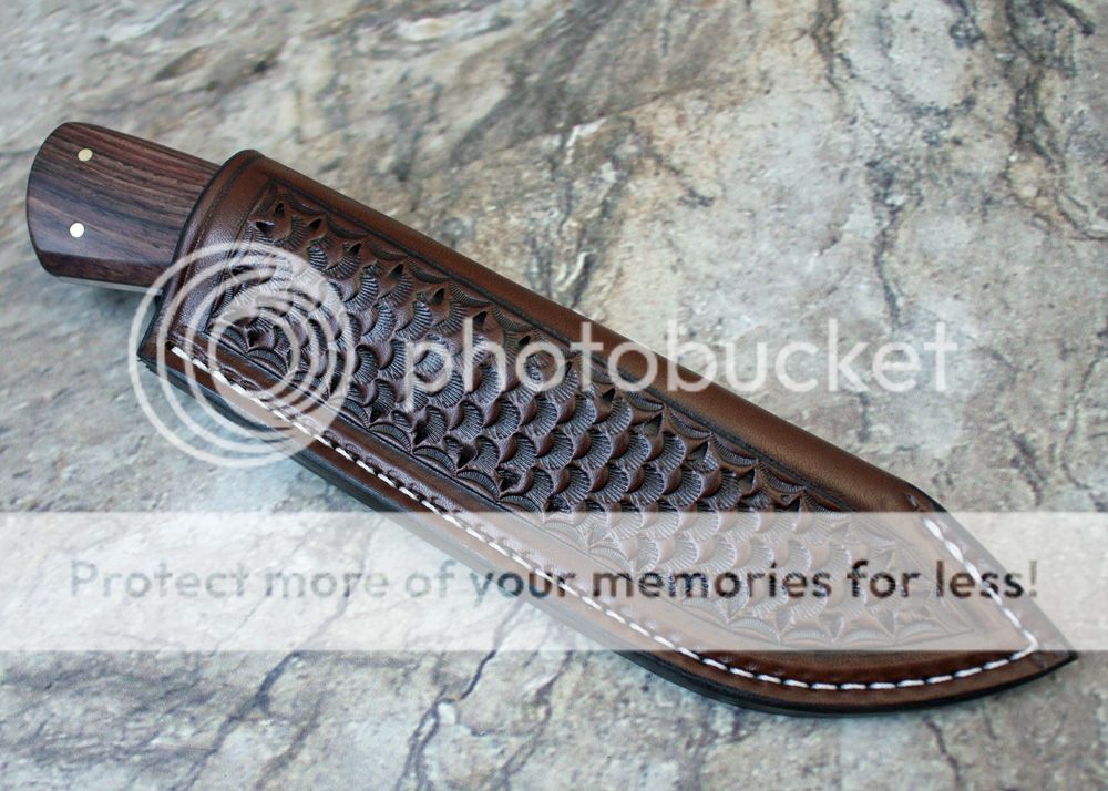 The sheath is 7-8oz hand tooled leather from Wickett and Craig. The sheath fits the knife nicely, as it was designed for this knife specifically.