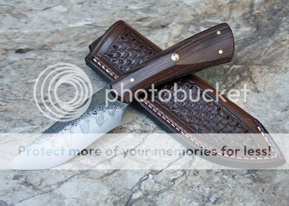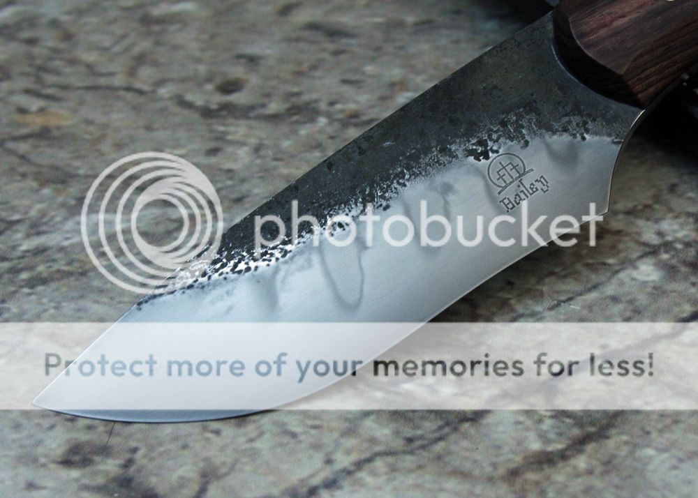 This is Hanson's W2, forged into a recurve hunter design. The blade has been ground on my rotary platen for a grind somewhere between flat and convex. It has been hand polished to 2000 grit and etched to bring out the nice hamon.
