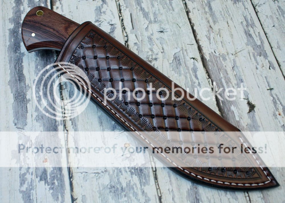 The sheath is 7-8oz hand tooled leather from Wickett and Craig. It holds the knife securely and allows for an easy draw.