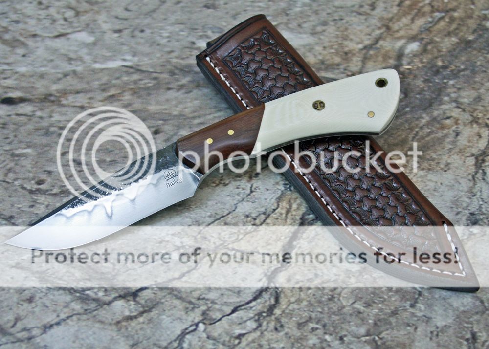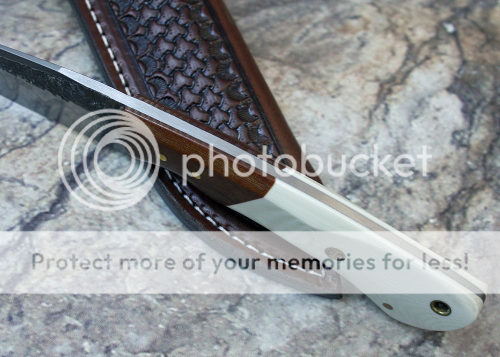 The bolster area is natural micarta bias cut to see the layers. The rest of the handle is white G10. Everything is held in place with pins and G-flex epoxy.