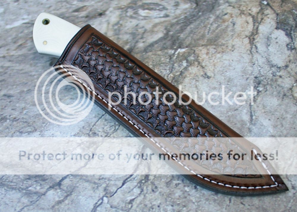The sheath is 7-8oz hand tooled leather from Wickett and Craig. It holds the knife securely and allows for an easy draw.