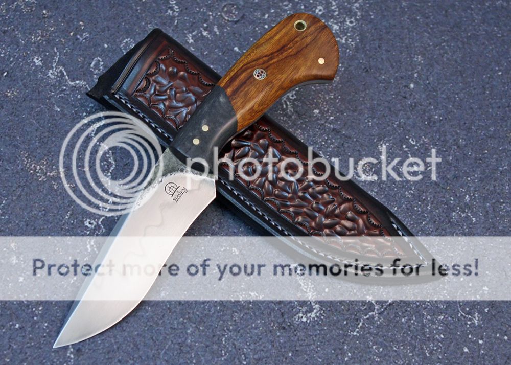 The sheath is 7-8oz leather from Wickett and Craig. It is hand tooled and it holds the knife nicely, yet lets it draw easily.