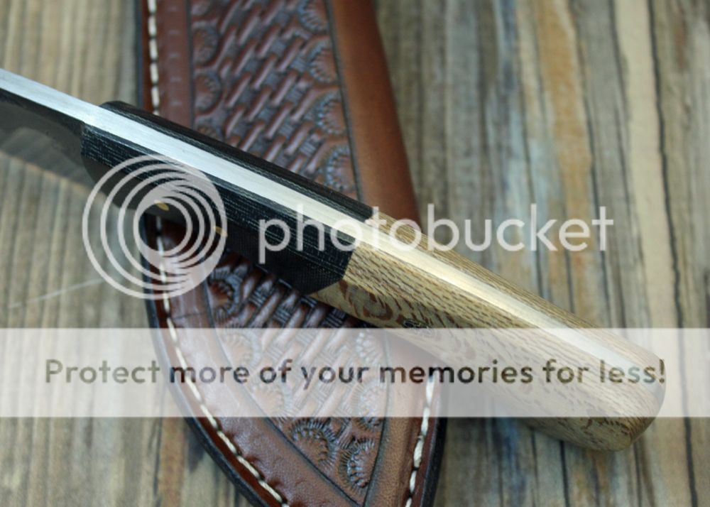 The sheath is 7-8oz hand tooled leather from Wickett and Craig. The knife fits well.