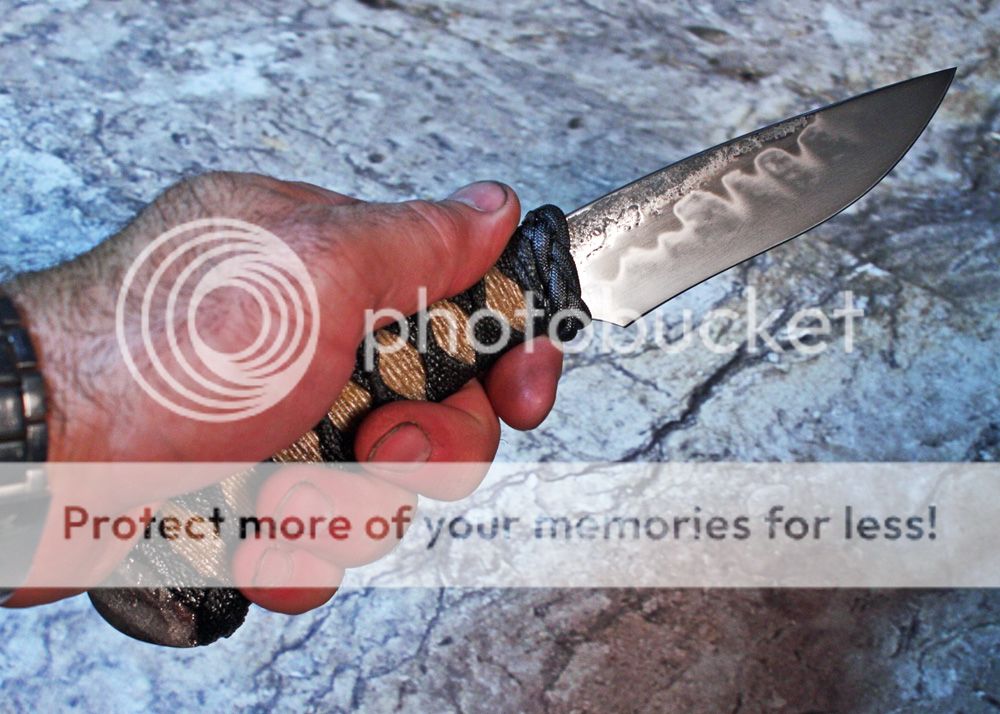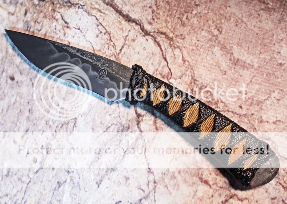 The handle is hemp and cord wrapped and soaked in boatbuilding epoxy to make it nearly indestructible. It is comfortable and provides great grip.