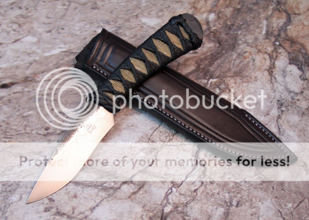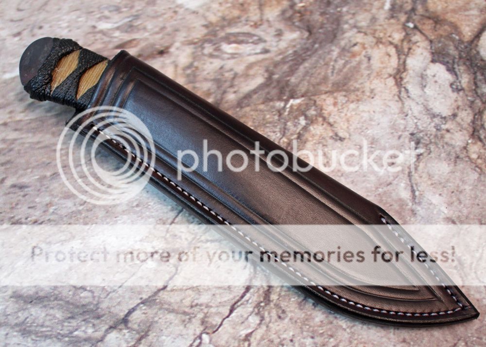 The sheath is 7-8oz hand tooled leather from Wickett and Craig. The knife fits well and draws easily.