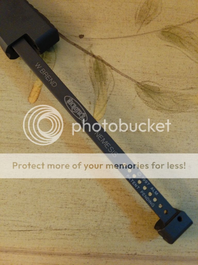 I'm selling an amazing example of early custom Microtechs. This is a seldomly fired and never used/carried/sharpened Nemesis from '99 with hand ground, by Walter Brend, black satin finished blade.