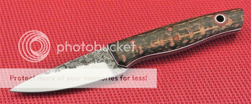 KE Bushie w/ brown canvas over natural liners & yellow pinstripes, SFT Convex on spalted 1/8 A2. Like new, very light use to check out knife feel.