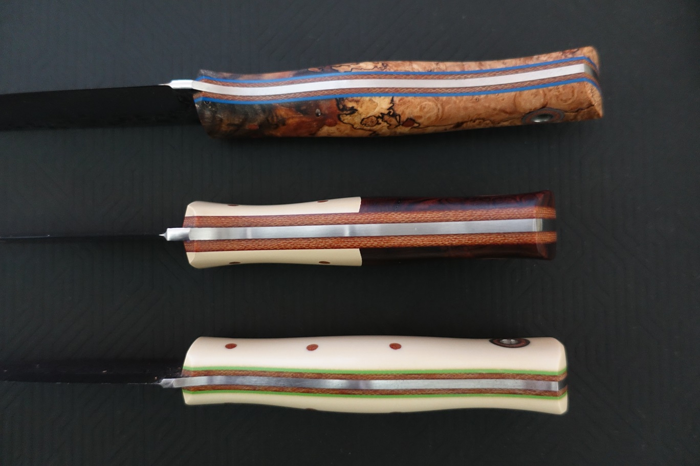 Revere with Oreo burlap bolsters and emerald green scales over black liners with white pinstripe on 5/32 cpm154 tapered tang.