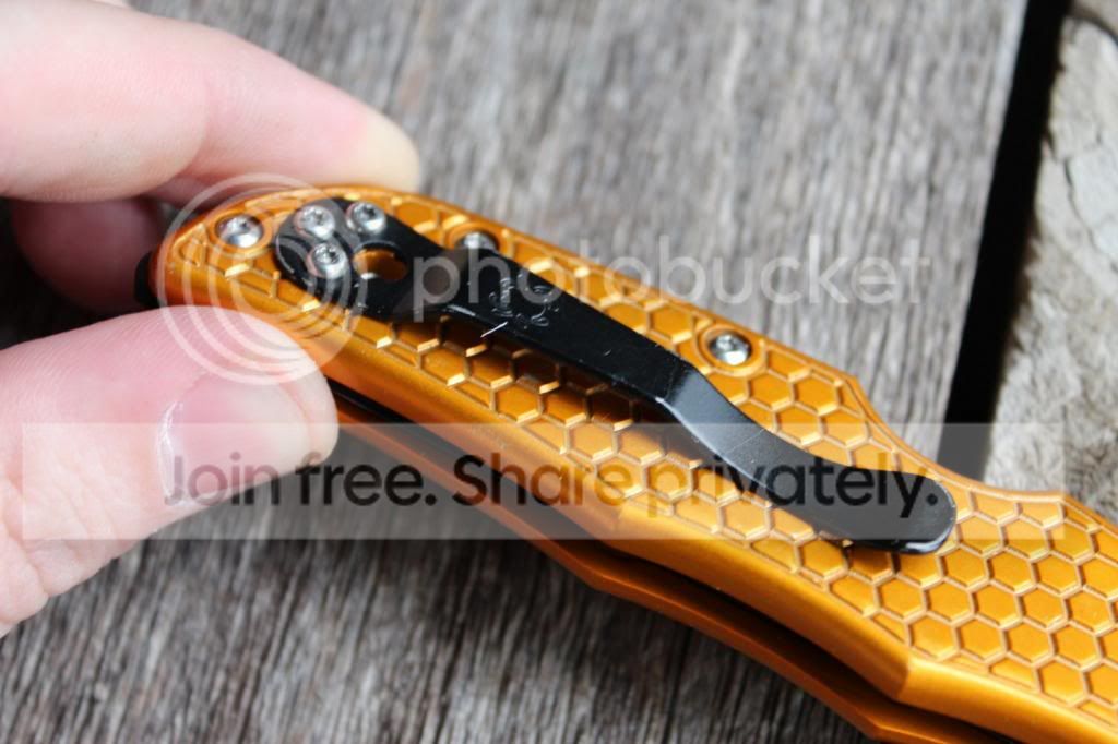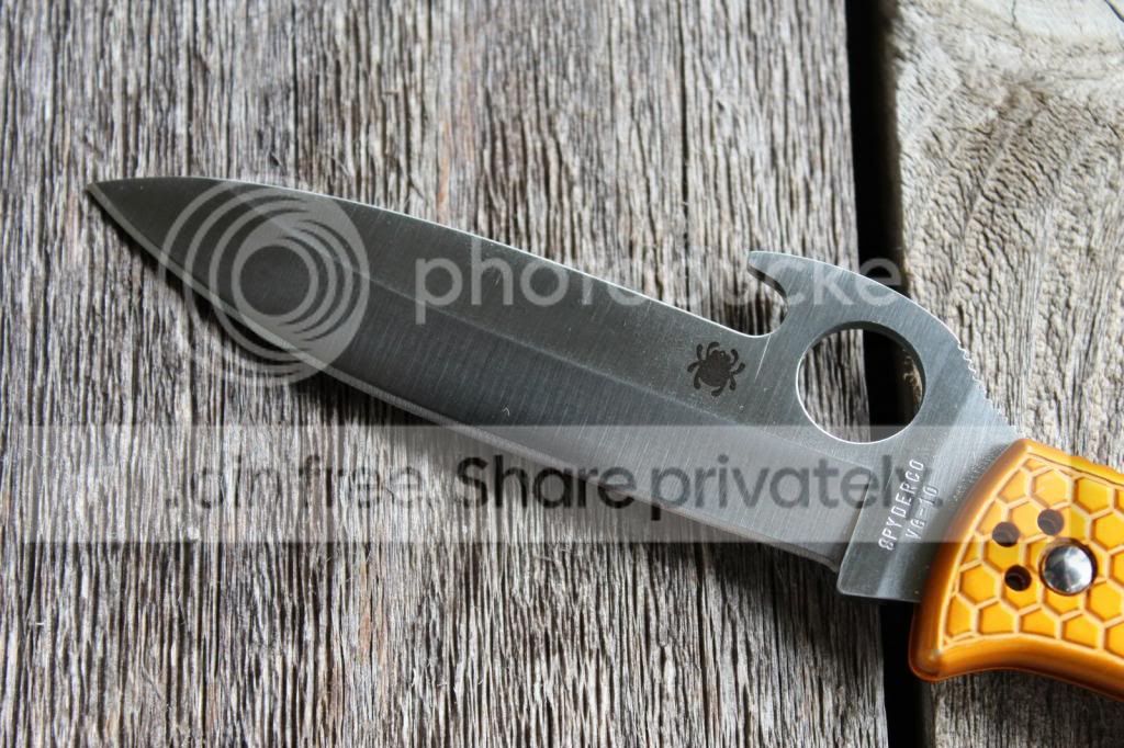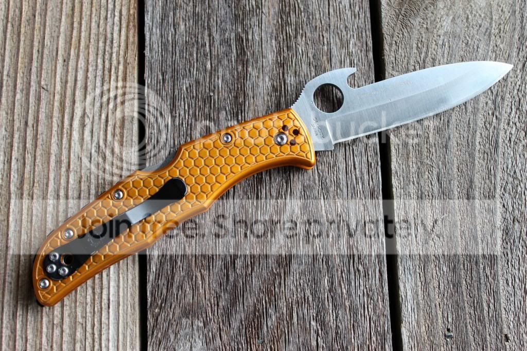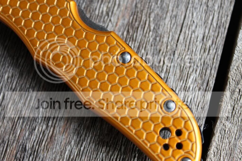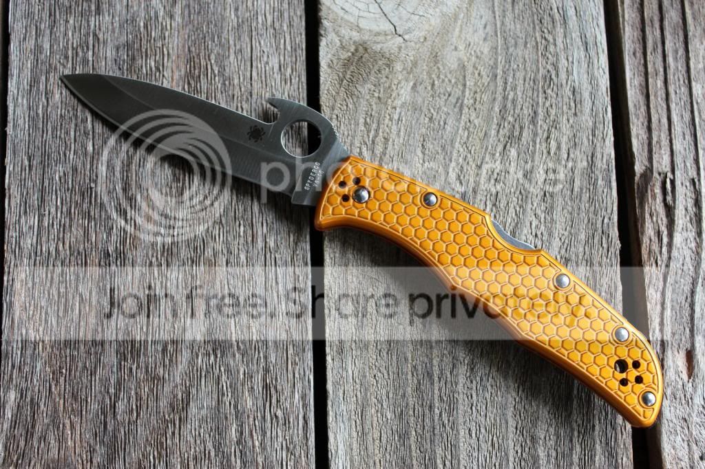 1) Orange Honeycomb Aluminum Scales on Spyderco Waved Endura Plain Edge - Bought this knife used, and I have used it lightly as well. It has a couple of light marks on the Al scales, and perhaps a couple of light scratches on the blade. Doesn't quite have as good detent as a stock Endura, also has a bit of bladeplay due to the aftermarket scales. Also has a custom black ridged backspacer. Awesome little knife, super smooth! Sorry, no box or original hardware.