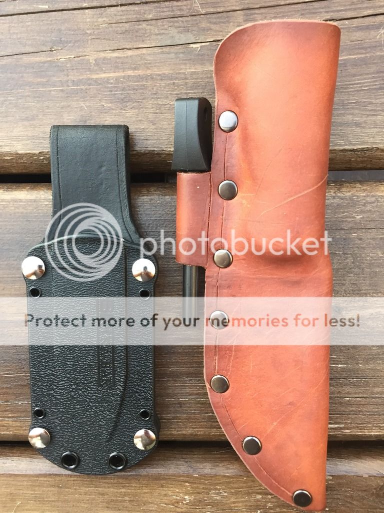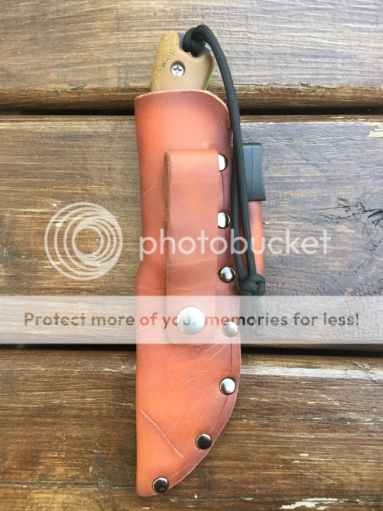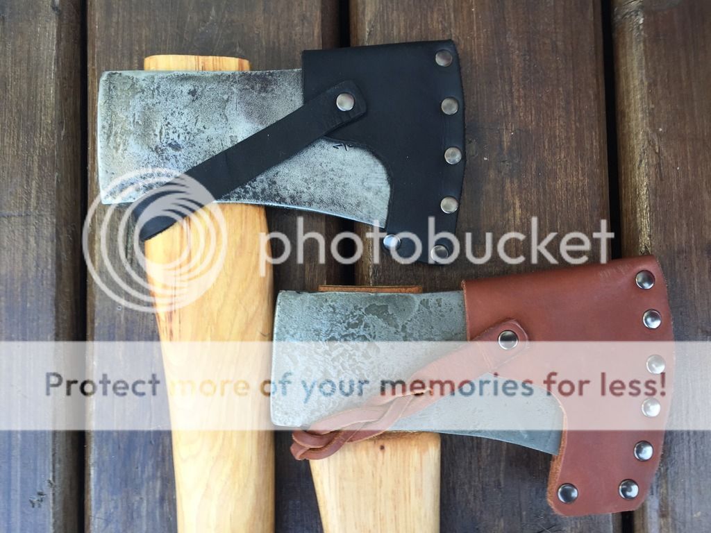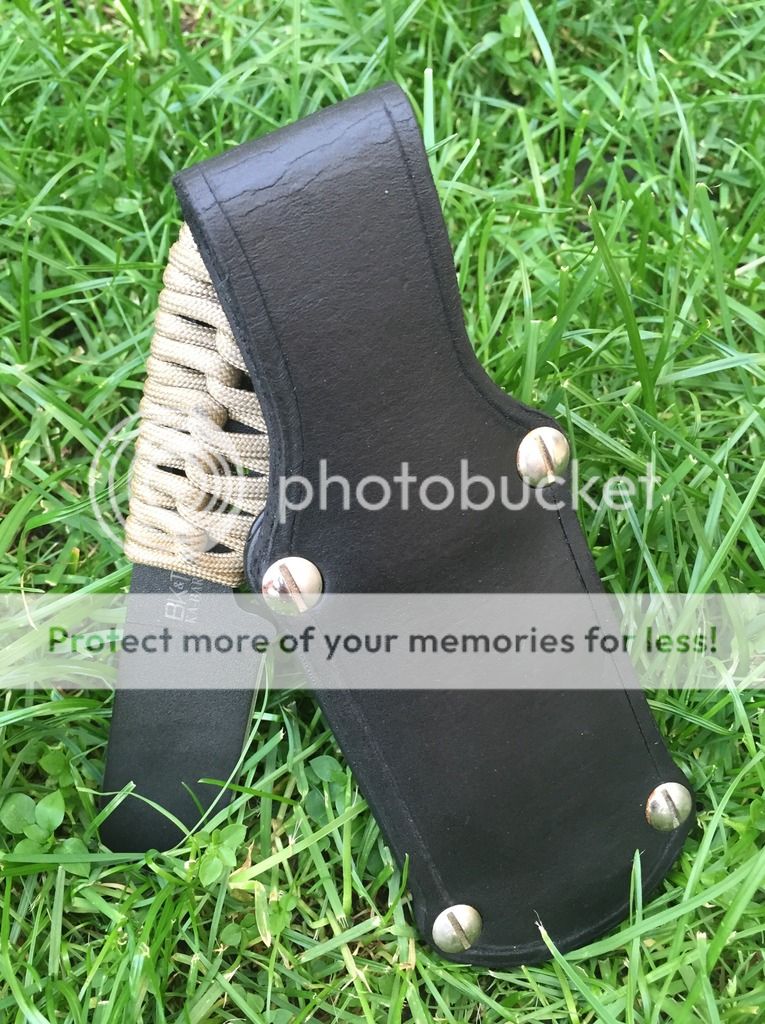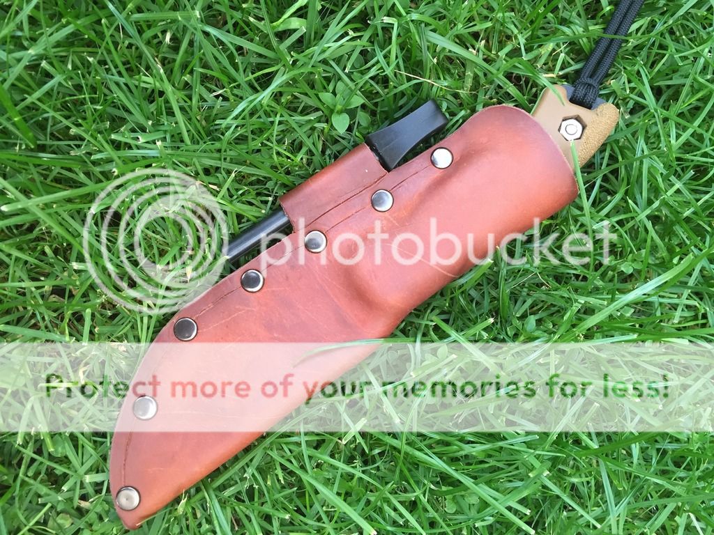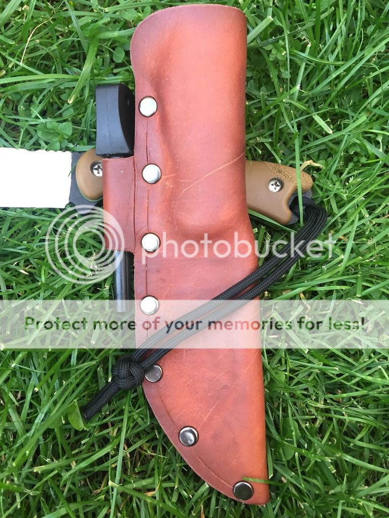 Not quite as fancy as Gassy's, but does the trick. Leather was "vinegarooned" with the stuff used to soak the axe heads in. Then liberally oiled up with Obernauf's. Still deciding whether or not to make the firesteel loop.