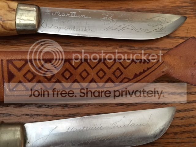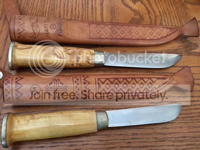I visited a nice older gentleman yesterday to look at a couple of Marlin 336's. We decided on a price and I asked hime if he had any old hunting knifes he wanted to get rid of. He said he didn't but a Finnish foreign exchange student had given him a couple knives years ago and I could have them if I wanted them. They look pretty good to me for free.
