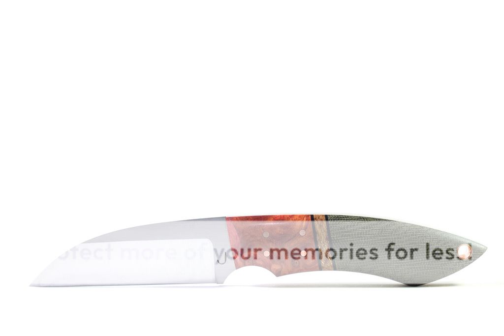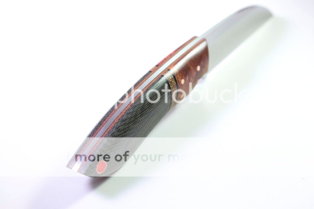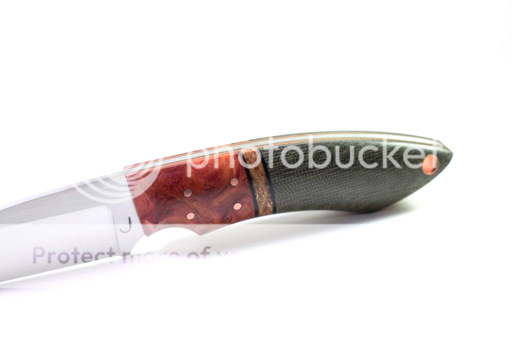 Scales are stabilized Burl, Kevlar, Micarta, and G10 with Copper hardware