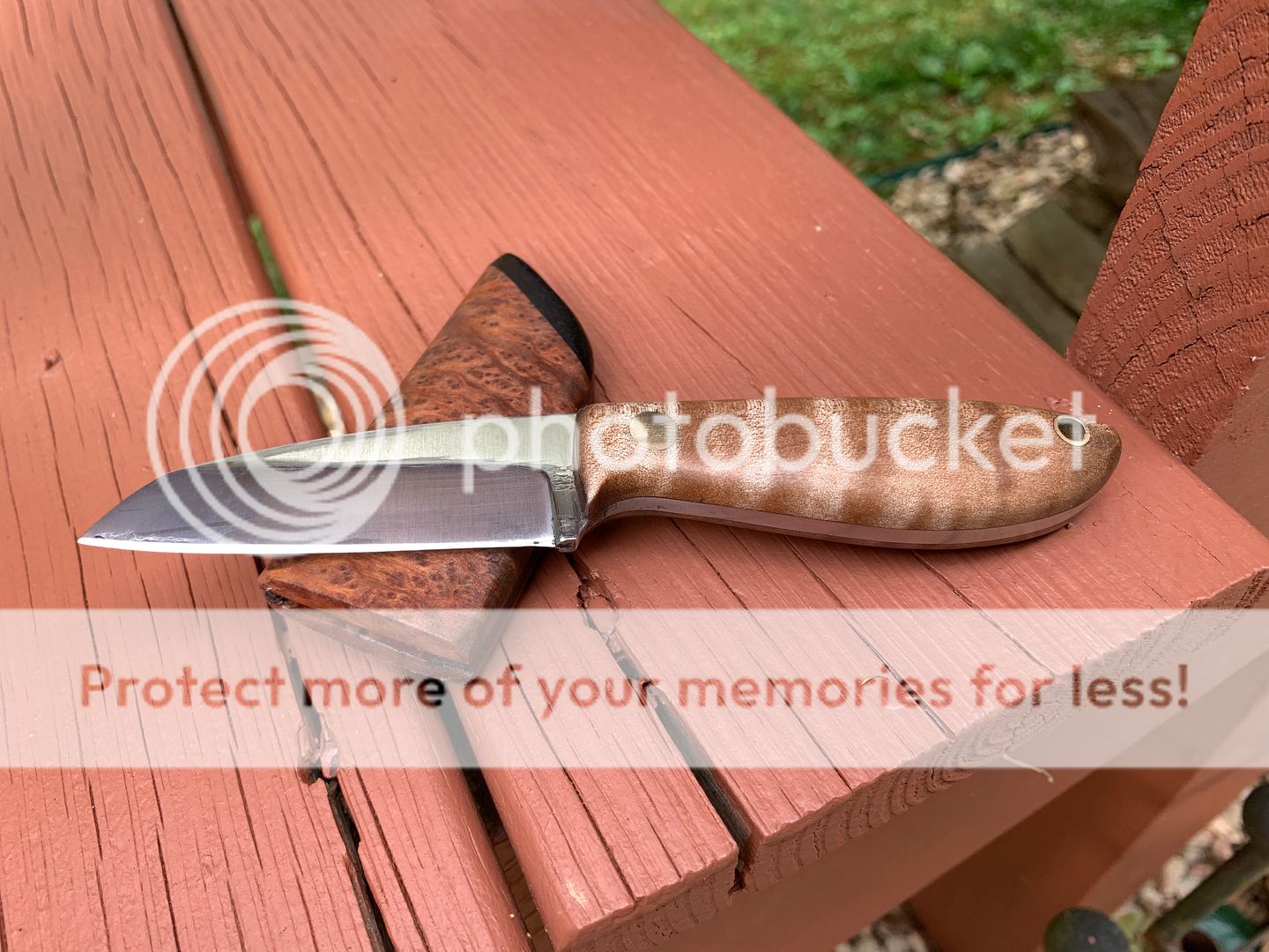 This is a 3” Brisa Wharnecliff blade set in stabilized curly maple. The scabbard is stabilized Amboyna Burl. The scabbard has (7) 1lb rare earth magnets inlayed in the inside of the scabbard. The magnets serve to hold the blade in the scabbard for safety