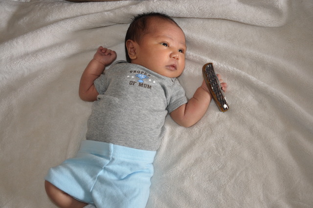 My son just turned 2 last week and from the time he was just a baby we have given him choices if we are torn between 2 or more items. In the beginning it would be which ever item he stared at the longest. Now he is very used to this and I think enjoys it. What I have been doing for the last 6 months or so is every morning before I head out the door to go to work I will grab 3 or 4 of my pocket knives and bring them over to him and he'll look them all over and say "that one dadda" putting his little index finger on the bolster of the one he has picked out for that day. Surprisingly he will usually pick a different one each day and it won't always be the shiny one with yellow bone or the biggest which I found interesting in the beginning. I absolutely love this little routine we have for several reasons. The first is it really melts my heart every single time and puts me in a great mood during my drive to work. The second is throughout the day no matter how bad my day is going every time I pull out my knife it makes me think of him and our little interaction that morning which then puts a smile on my face and all my troubles disappear. The last part is I have a feeling that these will be the memories that he will never forget and hopefully when he gets older he will remember them and will want to carry a knife just like dad carried. I would love to hear some of your stories and how you try to or did introduce your children to your collection, obsession, hobby or whatever you call it.