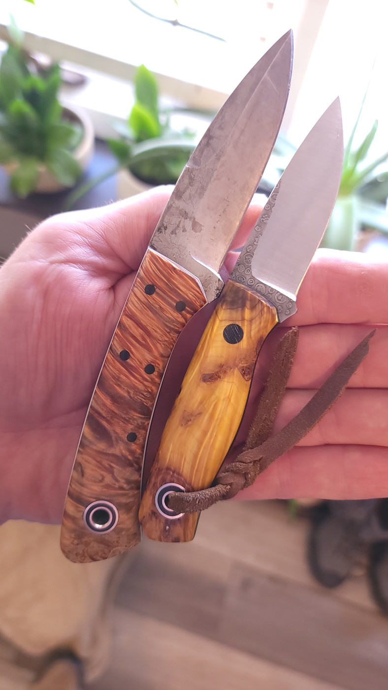 You never know, Andy used to keep in stock a rather large assortment of wooden handle materials, and he has great taste in his choices. I love the look and feel of wood, so I like having the Esquire in Osage for edc, but I don't feel like getting fussed at over wooden handled knives dripping water in the rian again, and I live in a rain forest, so for the project I'd like to do that I mentioned in another post, I'm only considering synthetic handle materials in either bright yellow to complement in a lot of the images, or bright colors that don't exist in nature here to contrast. And Andy does some of all of it, there is just never any know when what will show upI wonder ifFiddleback has more of this handle material. It’s ridiculously good!