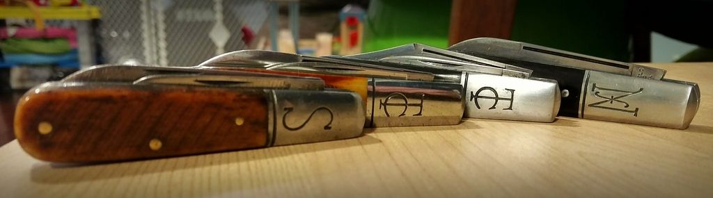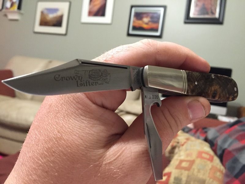 The unmarked one is the newest addition. It's a custom mod by Glennbad that I bought from the original owner. He took a Crown lifter and put buckeye burl covers on it and the lined barlow Bolsters. One of the original Beerlows!