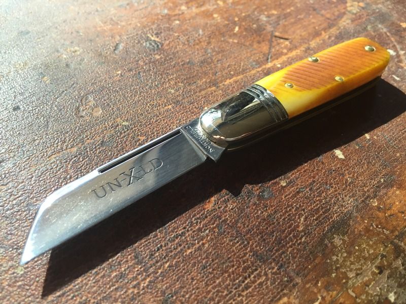 I just looked through my catalogs and they also made a plain unstamped bolstered Barlow, which did indeed have the normal tang stamps. On the three known styles, they used, bone, iron bolsters, and iron liners.