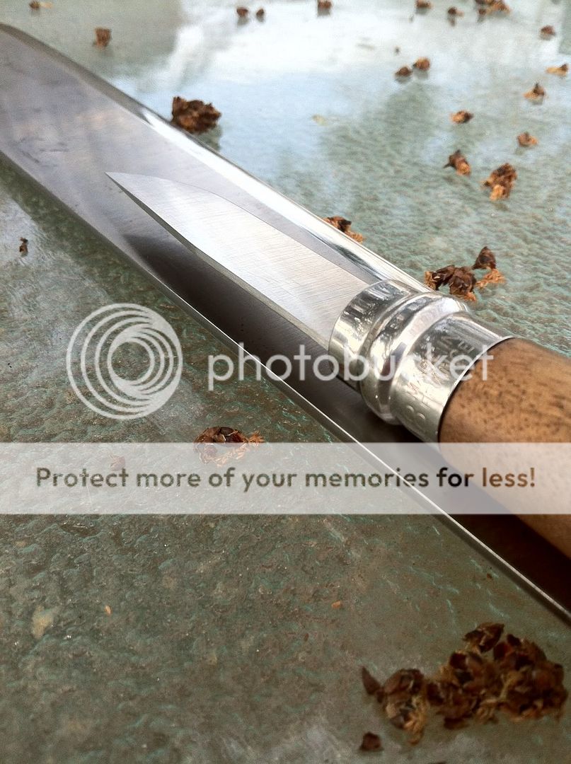Previous owner had sharpened it on one of those horrible kitchen-knife sharpeners -- you know, the one with the disks that you drag your knife through? *shudder* Now that I've got the edge cleaned up, it's just about perfect.