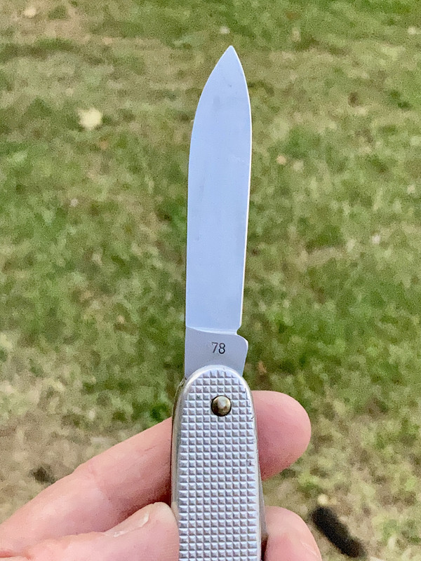) My first Moore Maker, and I think my first knife made by the USA version of Queen. It also has a normal Moore Maker shield on the mark side AND a blank shield on the pile side. One of my pics below is for ED, showing off the lid of my recycling bin as a platform for the trapper.
