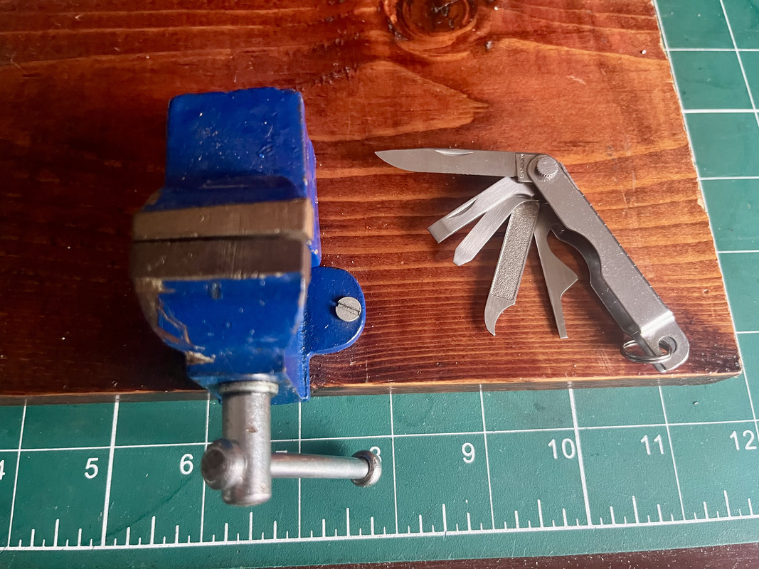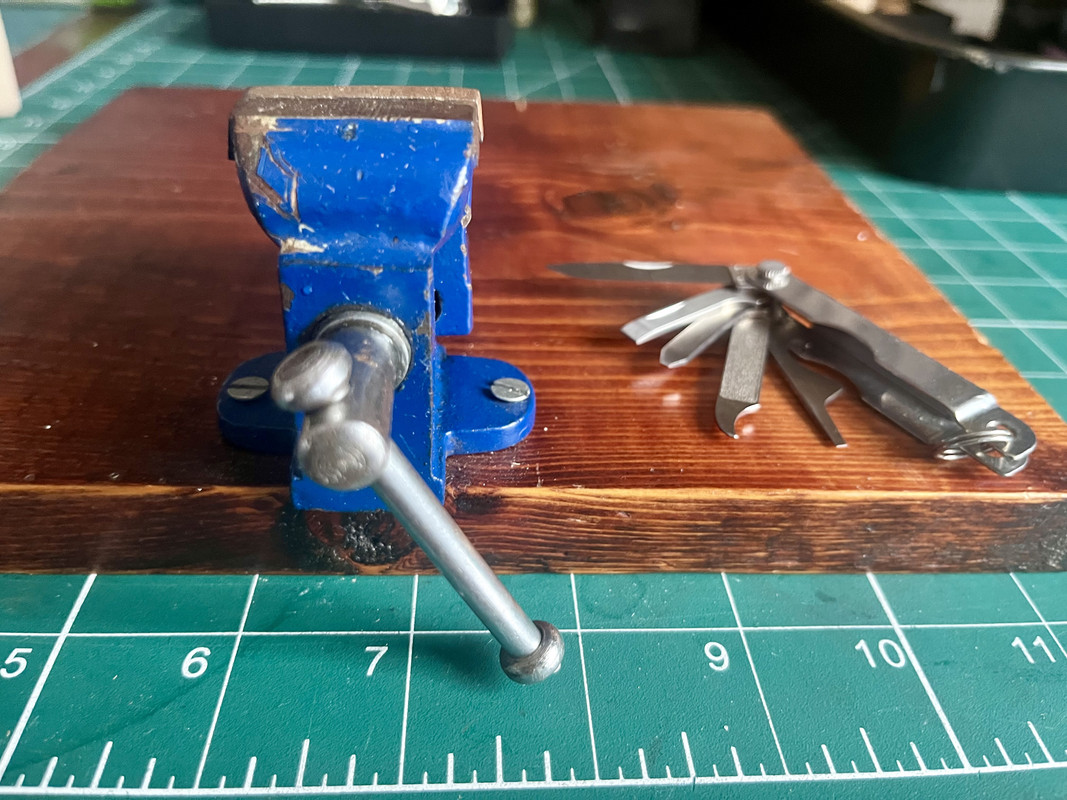 The little vice on a piece of wood I made 25 years ago when I lived in a flat and didnt have a shed,its been a big help its still good for delicate jobs..