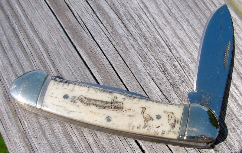 Then the mail came and I drove our Gator out to the mail box to get this one . GEC calls it a Bullet End Barlow . I call it a Bullet End Jack . After CE & CF it a lot , I have to say that they did a great job on it . The inlay of the Bullet Shield is superb . Just as they did on the 2 Remingtons that they made in the last few years . Centering , flush springs , no Burrs on the bone , bone saw cut grooves depth , sharpness , smooth fit in the hand , color match side to side . Just overall a pretty good knife .