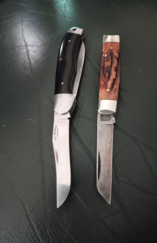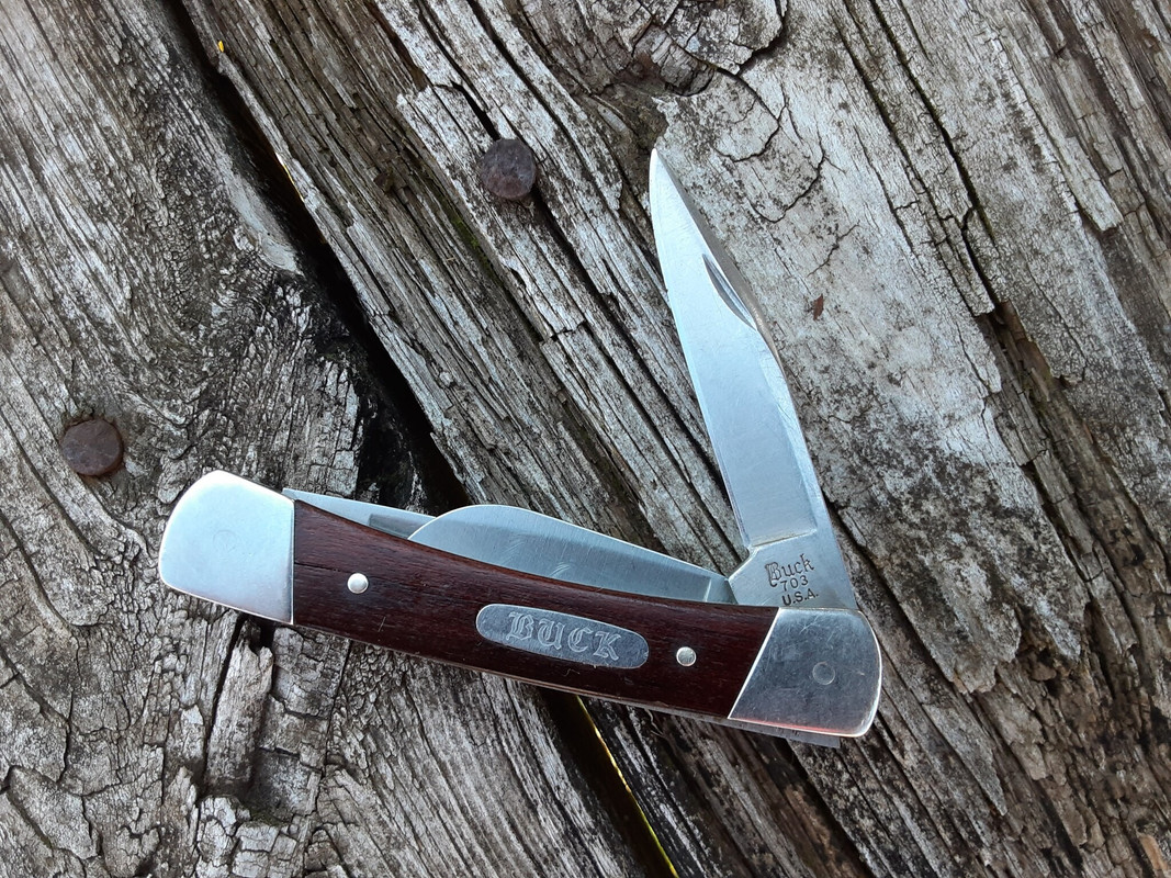 I bought one of those about 35-or so, years ago. I wanted something smaller than my Uncle Henry 885 for more dressy occasions.Today's carry is a Buck 703 my mother gave me for my birthday in '79 or '80. The 700 series was the first multiblade produced in-house by Buck. (The 300 series were still being produced by Camillus at that time.) I mention that because the blade steel of this knife appears to be 440C. The edge has that "carbide" feel. I did some searching and David Martin (RIP) also considered that the early 700 series knives may have had 440C blade steel.