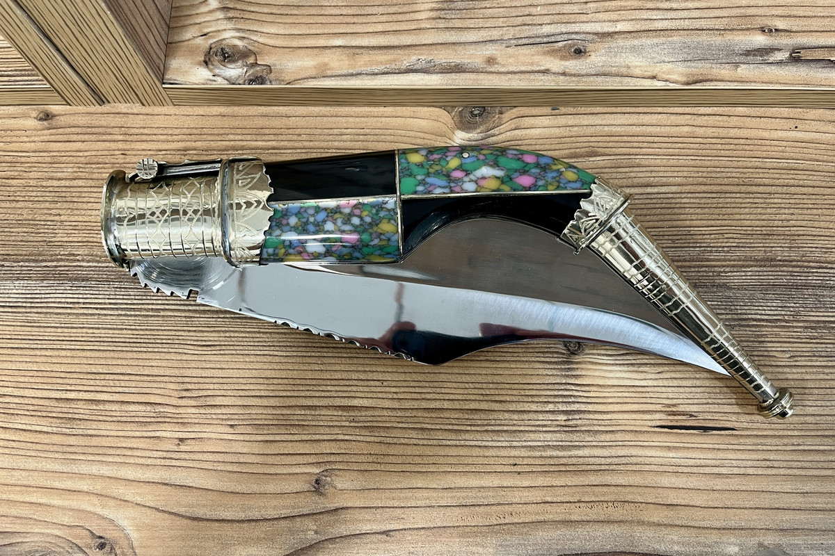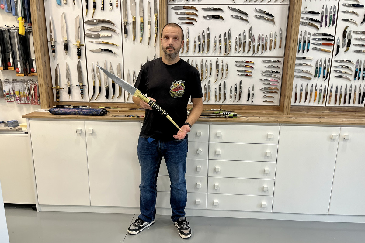 Here is the maker holding the one I bought for Jack and one for myself,thankfully they didnt cost 2,000 or more euros like some of his masterpieces (they would get you arrested in England).