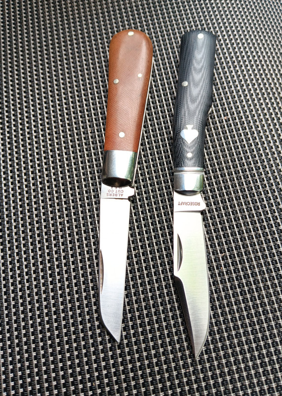 Being one who appreciates a knife well-loved, I like the yellowed and worn oneIt's a Sowbelly today. Pictured are two Amber Bone Sowbelly knives - both made in 2001. The top one is the one I'm carrying and if you'll notice, the orangr coloring in the bone has worn away and the jigging itself is worn and showing very very very light yellowing of the bone while the bottom one hasn't been used or carried and the full orange coloring is prominent with no yellowing of the bone and the jigging is crisp and sharp.
