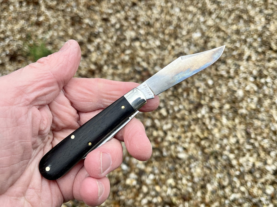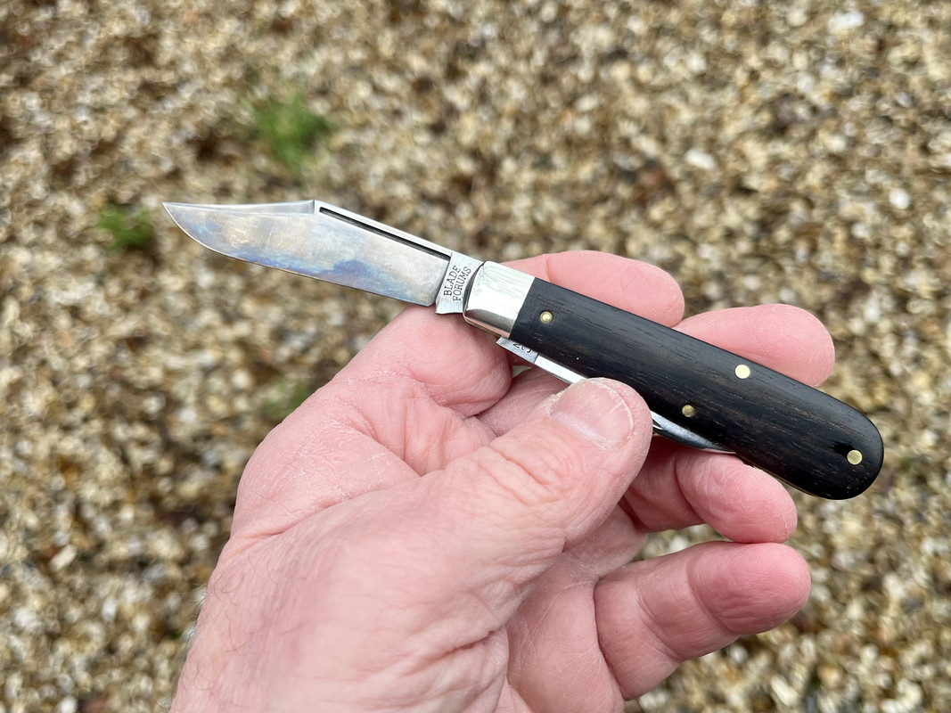 Congrats on the new work knife!I’m carrying something a little different today. Last Friday Mrs. Crappie ordered one of the blue bone Rosecraft Barlows for herself and this rosewood Loom Fixer for me. Of course you all know about the great fit and finish on these and the D2 steel. I think it’s a good solid working knife and at $60 a pretty decent deal.