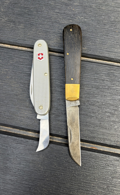 I like how the Hemlock Green (hey! I voted for White Bone) bone of our fine Blade Forums Barlow sets off the faint red streaks in that Walnut. It is one fine piece of Black Walnut. Or perhaps, since you're in California, English Walnut grafted onto Black Walnut rootstock and it's called Claro Walnut?