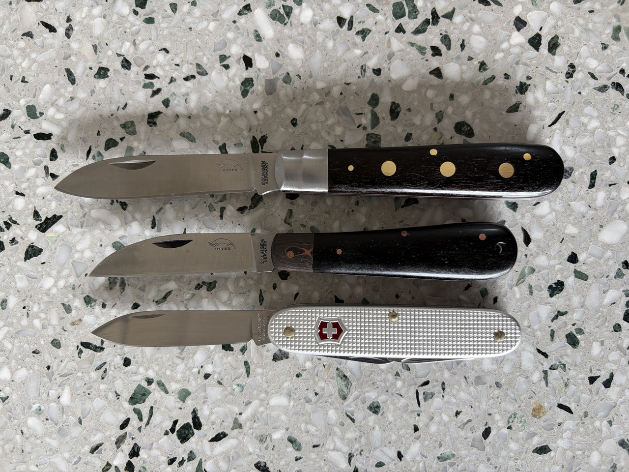 I tried forcing a patina with instant coffee, this is the result. The smaller one (nr 8) is new, the nr 10 has been with me some years. After I loaned the 10 to someone who left it soaking in the kitchen sink it needed some renovation so I thought to try something new. Both knives handles are bathed in oil and waxed, I packed the pivot areas with petroleum jelly. These are both very sharp as my thumb can testify. I must say I really like Opinel knives, I plan to get a nr 5 and mod it.