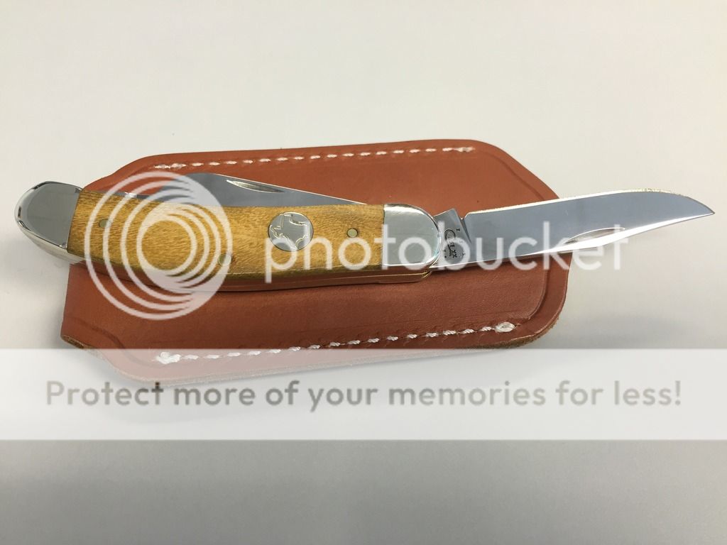 TB, those wood-handled Case sheepsfoot knives are so appealing - simple and all business!! :thumbup::thumbup: (I should find me one of those, or maybe just a Klein Tools utility knife that's basically the same pattern....Day #2 for the 11031SH; since I received it I've been fascinated with it. It's a hard knife to put down! It's slender but feels good in the hand, that big sheepsfoot is a wonder cut-all blade, and you can't help but feel classy taking it out to use.Unfortunately, I've also been clumsy with it -- put a bit of a ding on the end of a bolster running out the door trying to do too much at one time. Oh well, it was always meant to be a carry knife anyway, and it's still beautiful.