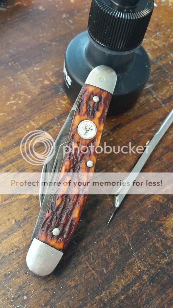Thanks for the positive feedback, folks! The disc is about 2.5 mm thick, and I deepened the inset a good amount to get it in there, so it's kind of a tight pressure fit. I'll carry it like this for a while. (maybe the shield will fall out on one of my nice wood handled Bokers and I can switch them out.![]()