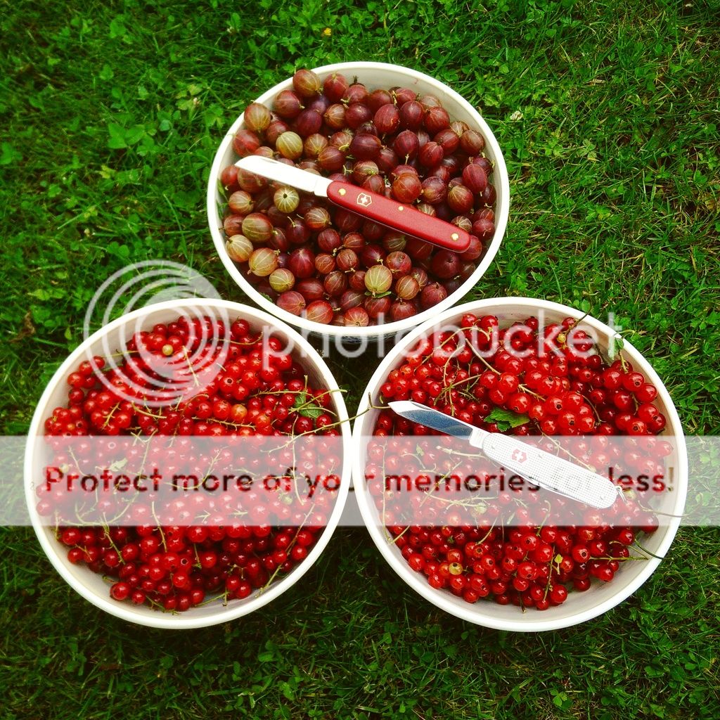 The top ones are gooseberries, whereas the bottom two buckets are berries from the currant bush. The red variety, quite obviously. They're really good!