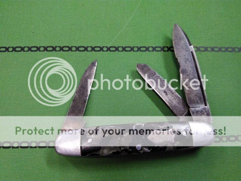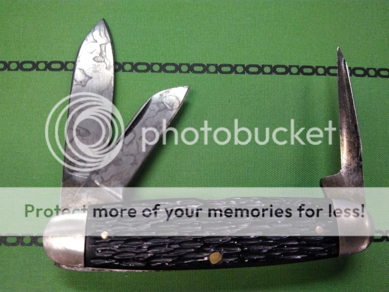 I don't really know much about this one...I got this Pal in a trade a while back, in a pretty sad state. The main blade had a ton of play, and all three blades looked like they had been sharpened on an 80 grit belt with grind marks 1/3 of the way up from the edges (I really should've taken before pics). It got tossed under the display case until I came across it yesterday, when I noticed it has a punch and got a wild hairI got the main tightened up, sanded out the grinder marks, and started a new pickle relish patina (the only thing in the fridge at work). I also got the punch sharpened up and it's pretty sweet, cuts a nice round hole in a leather belt with little effort