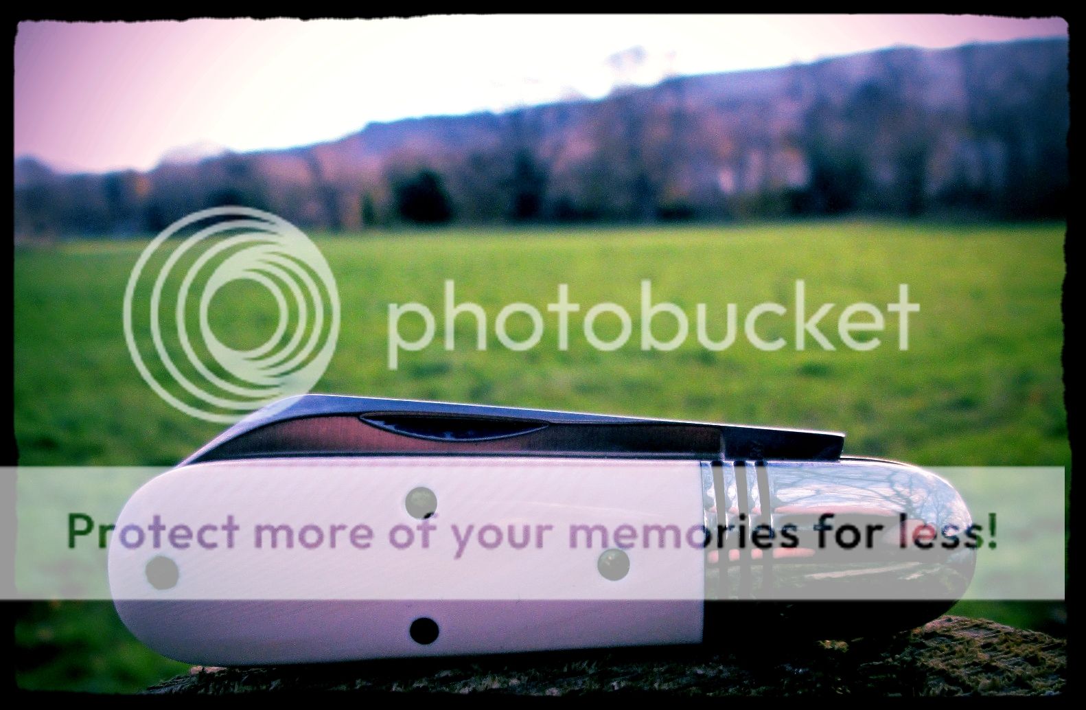 The blades all have a saber grind, though the top edge swedge locations are slightly different (for example, the two on the left). Some Coke bottles come in bone, too, like this Queen folding hunter from 1931-1955, also with a saber grind:Really like the blade grinds and the eclectic coke-bottle-handles.
