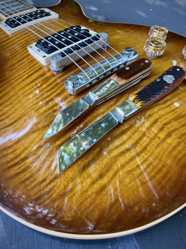 Aaand, to keep the knife content flowing...This is a Barlow and a 93 on my main LP, 2001 Standard with a ton of miles, which is riddled with tweaks. Push pull pots, bumblebee caps, RioGrande pickups, new saddles, etc, etc, etc.