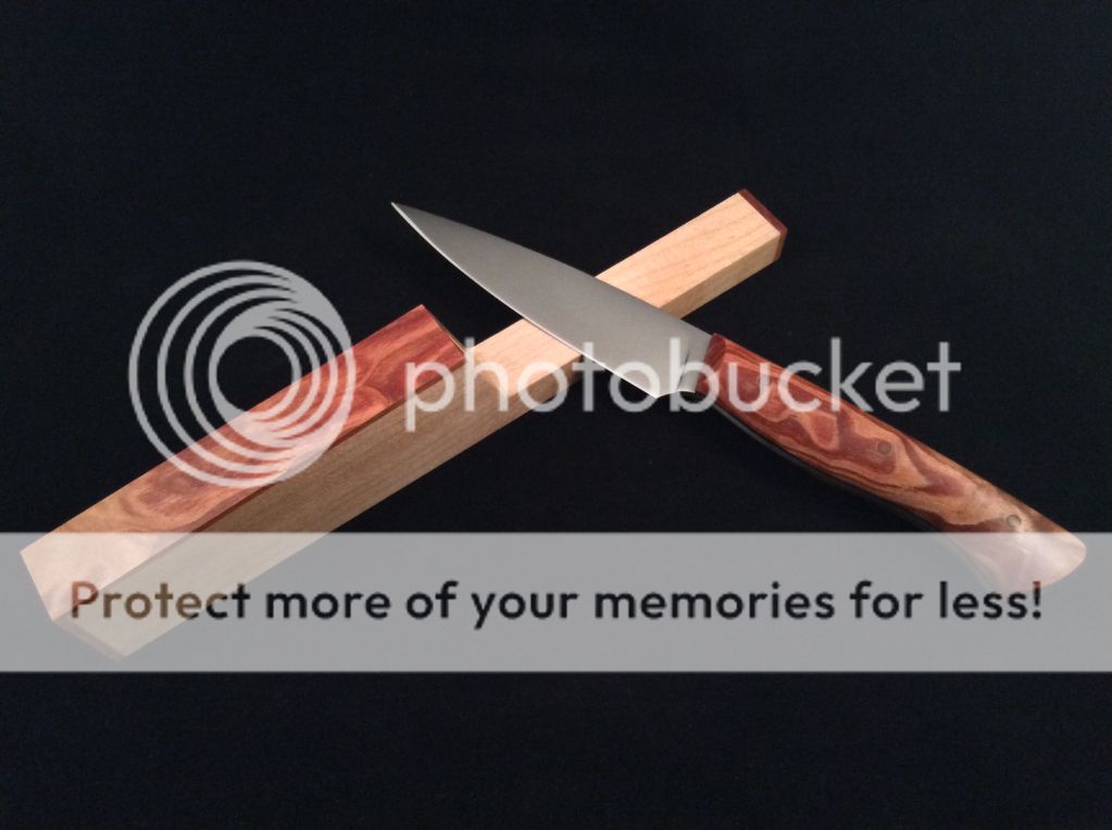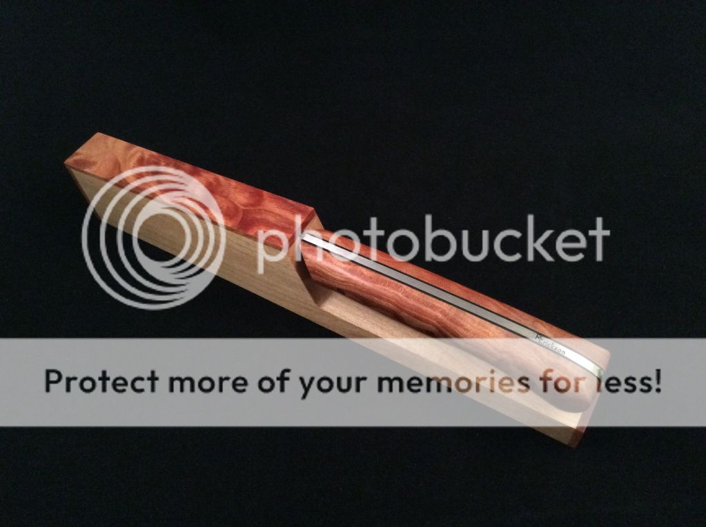 A little while back I posted a picture of a forge and venture type burner I built. I have been playing with it. It seems to work well, the question was whether it would make welding temps. Several days ago I thought about that once too many times and put together a small billet (4x1x7/8) of 1080 and 15n20. Having no press or power hammer, well you know how that goes. So this is the result of an 8 layer, dry welded billet from my forge. I am happy with the result, but need more and bigger tooling! Jess
