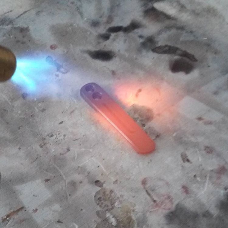 Heating a Zirconium clip! This was my first time working with Zirc and I really like the material. The blackened finish is extremely durable... I was experimenting with my finish and had to use a ceramic belt to grind the black off.