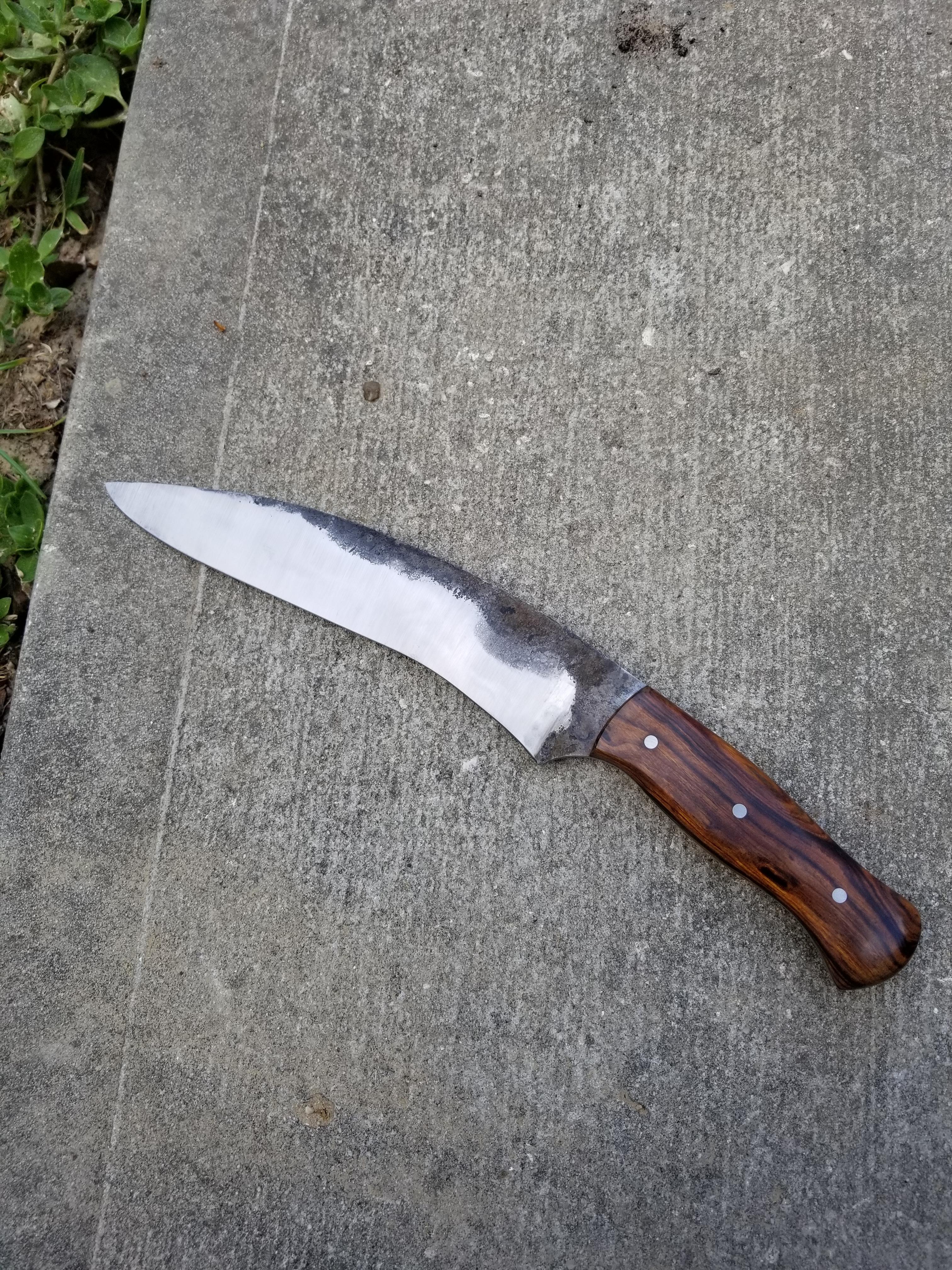I like the long petty style and recently did one myselfThis is a 210mm Petty that was designed based on input from Carl Kristian Frederiksen, chef at Dill restaurant in Reykjavik. The blade is differentially hardened W2 @62 HRC. The handle is sugi cedar with buffalo horn and nickel-silver accents and the saya is Hawaiian koa.