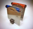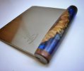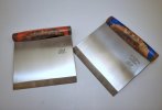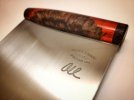 I'm making a knife for a local chef and he asked for a pair of dough knives for a gift. Wasn't sure how to make them unique so I made some burl resin handles and etched the owners signature into the blade.