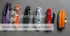 I've got: a couple classic red SAKs, Opinel 8, orange S2 Juice, blue CS4 Juice, Rat 1, CRKT Mcginnis Premonition, Kershaw OD-2, Kershaw Hawk, Boker Plus Titan, Mora Classic Number 2 (ground to ffg), Kabar Short (ground to ffg except for the tip)