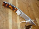This knife features Brass "Eagle Dancer" inlays set in Desert Ironwood. The handle consists of Black Jett, Red Coral, Turquoise and Brass spacers. It features sculpted Brass bolsters with Brass linings and a 3" "Chip Flint" blade etched "David Yellowhorse Serial #0292" on one side and "Buck Custom U.S.A"