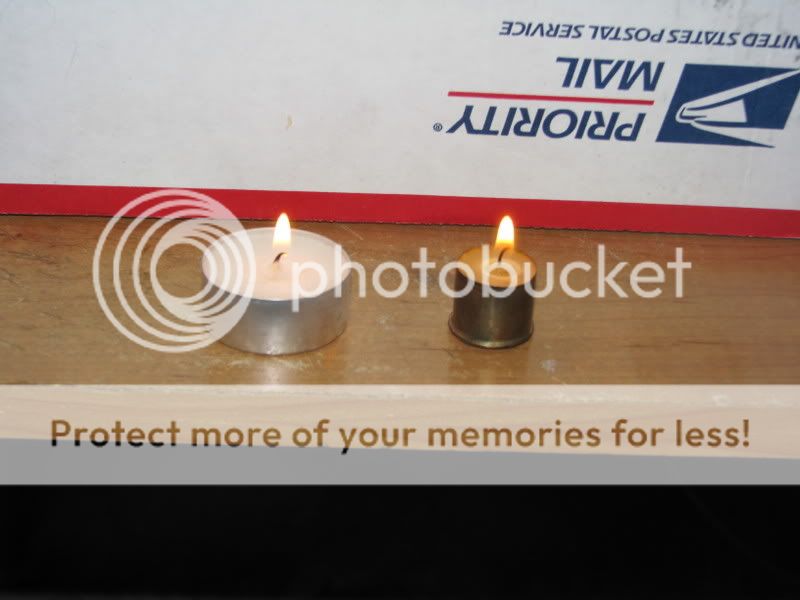 I took a couple pictures, I stink at taking pictures, but you get the idea. You can see the candle I made burning itself out. I made one out of a 12ga base as I wanted a smaller candle, but even that did not work. It works for about 15 minutes and then starts to die FAST. So don't be fooled and fire it up in the house for a couple minutes and think you are good to go, because you are not. As the wick burns up, the less heat you have and the more the wax hardens, and the less melted fuel you have until the wick if gone.