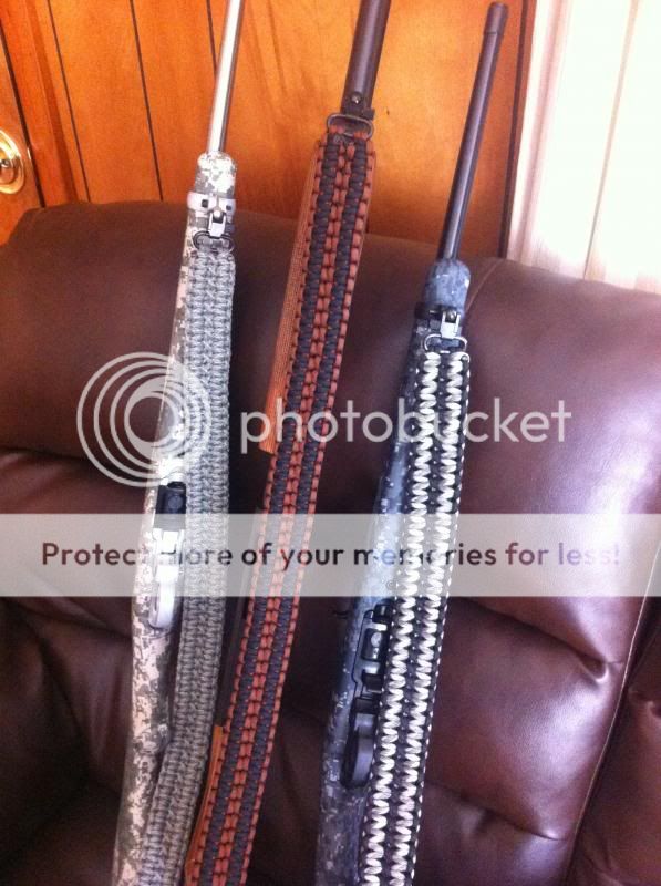 here is what I was doing. Well the ACU camo one anyway. 5 to 6 hours to tie one of these things and my hands are showing it. Never really thought about doing any but about a week ago my son wanted to do one for his 870 and that lead to the ones for my 10/22s. These are 35 in and have about 125' of cord in them. Very hard to match the colors Ruger uses in their stocks but the brown-black on the 870 is dead on. Anyone else ever tie any up?